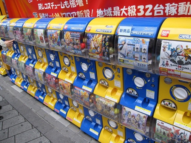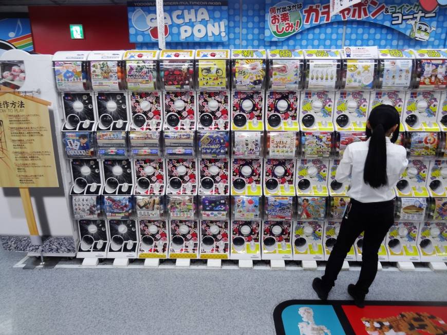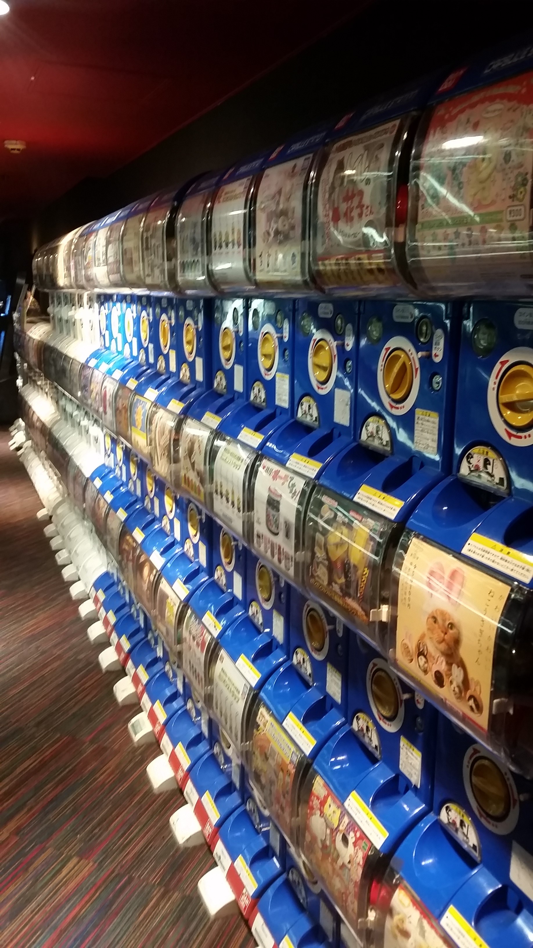 You know those 25 cent machines at the front of the gas station or super market that dispense plastic bubbles with a prize inside? Well they have them in Japan too…only theirs are on crack. While ours might contain a sticker or plastic ring, theirs contain anything from pet clothing, to 6” robot or anime/game character models, to phone accessories and the prices usually float around the equivalent of two to eight dollars. And by the way…they are everywhere!